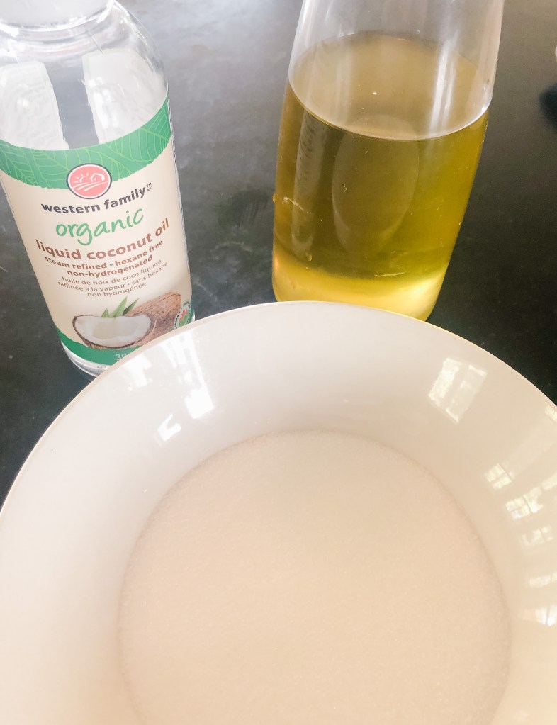 Start with 1/2 cup of sugar and add in 5 tsp of oil. Now, I used a combination of liquid coconut oil and extra virgin olive oil. Whatever oil you have around will work, just be mindful when choosing. For example, coconut oil is great for moisturizing the skin and olive oil is an antioxidant.