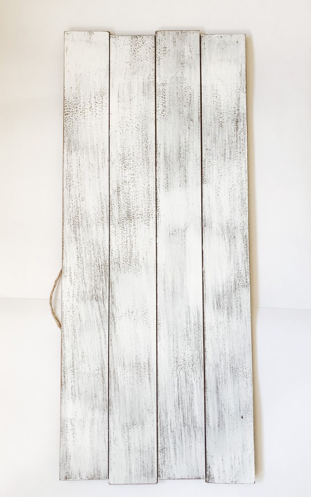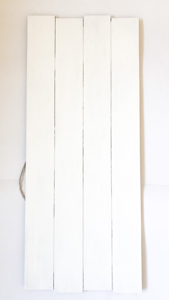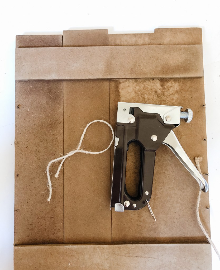 Before continuing on to the front (trust me, this makes things easier by doing this first!), flip the board over and add a way to hang the board. I used rope and a stapler to create a hanging feature at the top that will fit over a nail on my wall. You can skip this step if you don’t plan on hanging it and just leaning it up against a wall on a shelf!