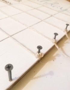 Now flip the board back over to the front. I used screws, although I’m sure nails would work fine as well. Add screws at each pencil mark where the month is written from. After the screws are in place, take your string and try it around each screw making sure the string is as tight as you can get it. Make sure to leave a little tail string on each side. We will make sure the string is tight later on as well.